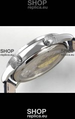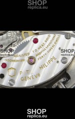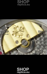 Genuine Swiss 9015 Movement assembled to Resemble the Authentic Patek Philippe PP 240 Calibre Style Movement. Updated Rotor, Bridged and Engravings on Movement with Rose Gold Plated Patek Philippe Stamped Rotor