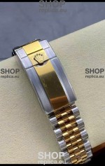 Two Tone Yellow Gold Plating. on 916L Stainless Steel Strap linked with screws, the best bracelet manufacutred up to date for the GMT Series with Flip Lock Style Clasps complete with Rolex Markings and Engravings. 2MML Lug Spring Bars with rounded heads exactly like the Original GMT Watch Straps.